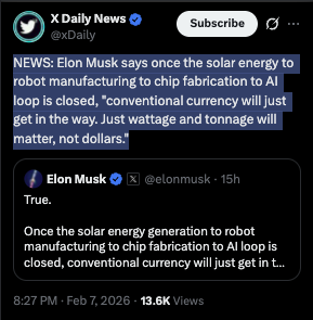 “Once the solar energy → robot manufacturing → chip fabrication → AI loop is closed, conventional currency will just get in the way.